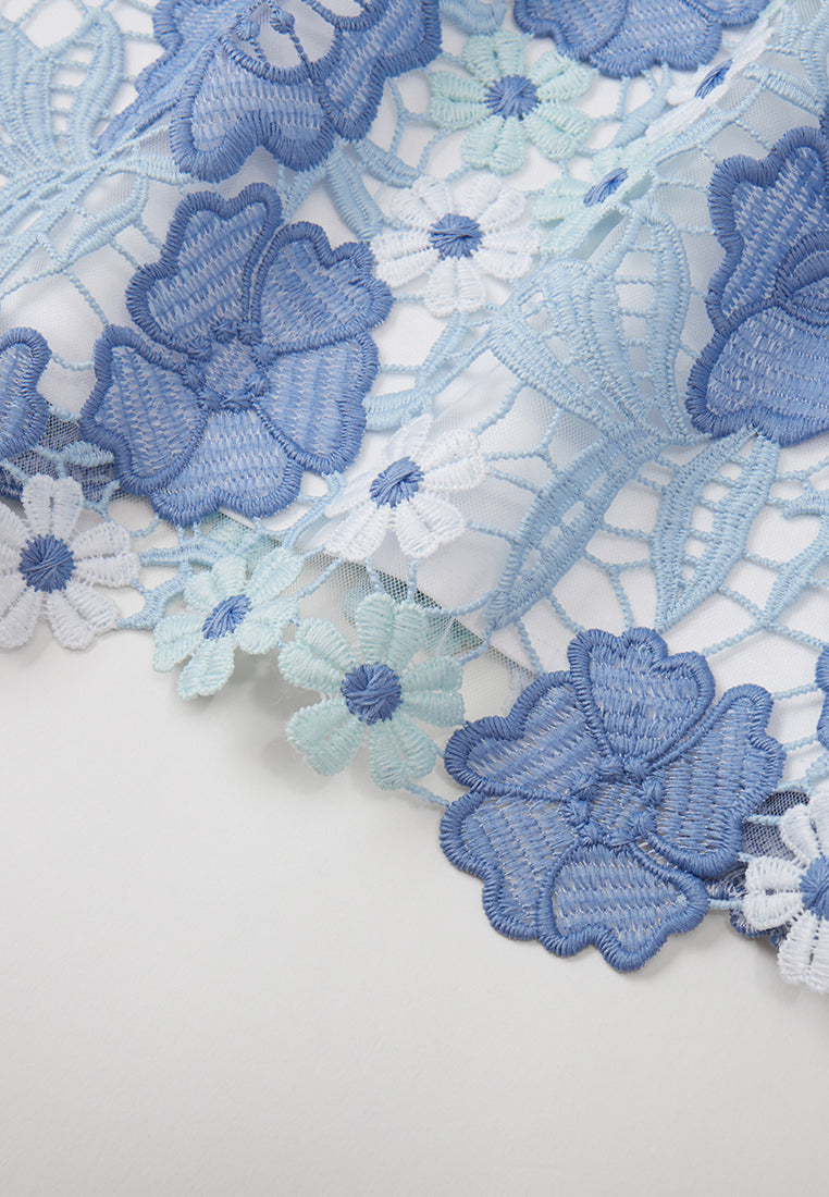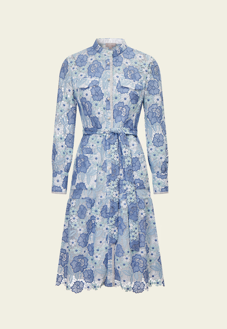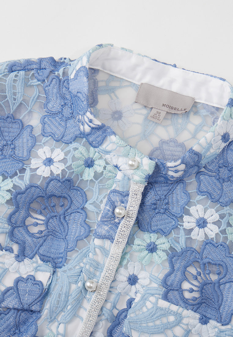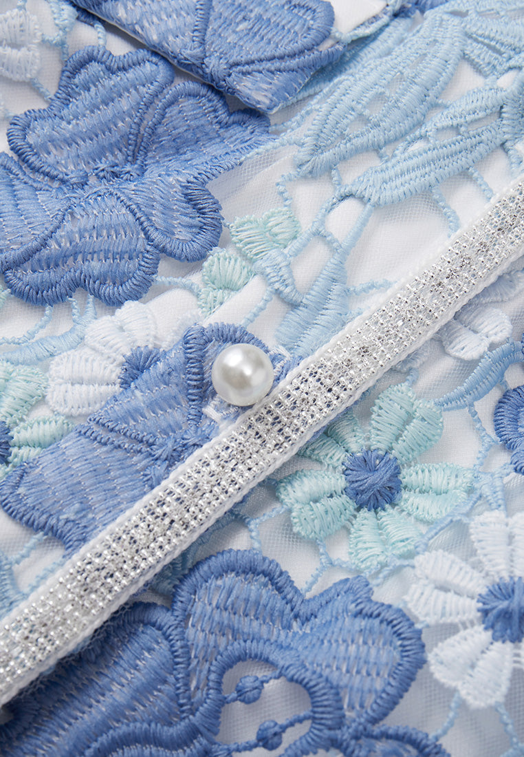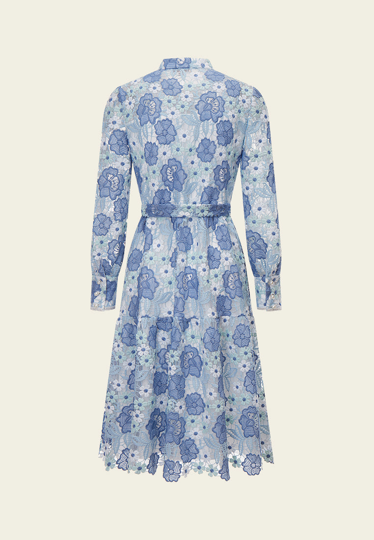 Floral lace dress boasts visually cooling down blue tone colorway. Featuring MOISELLE's signature four pockets design. Finish up with pearl buttons, echo with the rainy feeling. Ideal smart-casual workwear for meetings, seminars and any daytime commercial occasions.